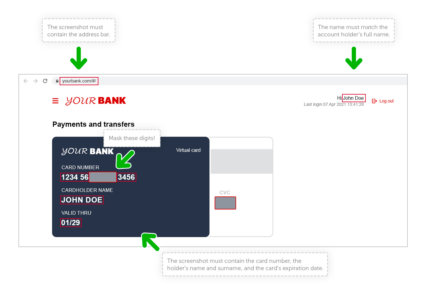 Yes, you can deposit and withdraw funds using an online card. For this, you need to verify the card in the Verification > Card Verification section of the Client Area. Alternatively, you can verify your card through InstaVerify mobile app for Android and iOS. To verify an online card, you need to download a screenshot of the card which must display the following data: URL of the online banking page, the first 6 and last 4 digits of the bank card, the expiration date, and the name of the cardholder. If this information is on different screenshots, you need to download all of them.