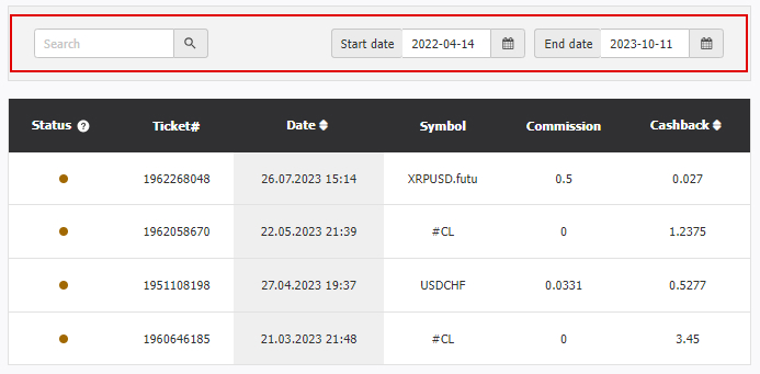 โปรแกรมคืนเงินทำงานดังนี้: คุณเพียงแค่ทำการซื้อขายตามปกติและปิดธุรกรรมตามเครื่องมือที่เลือก ในท้ายที่สุดของวันการค้า ธุรกรรมที่ปิดจะปรากฏในห้องทำงานของลูกค้า (KK) การเปลี่ยนแปลงที่เกี่ยวข้องกับการได้รับเงินคืนสามารถติดตามได้ที่ KK/การดำเนินการทางการเงิน/คืนเงิน ในส่วนนี้ จะแสดงการทำธุรกรรมทั้งหมดในแต่ละวัน พร้อมด้วยฟังก์ชั่นค้นหาตามเครื่องมือและหมายเลขคำสั่งซื้อ รวมถึงการเลือกช่วงเวลาการแสดงธุรกรรมและสถานะที่เกี่ยวข้อง