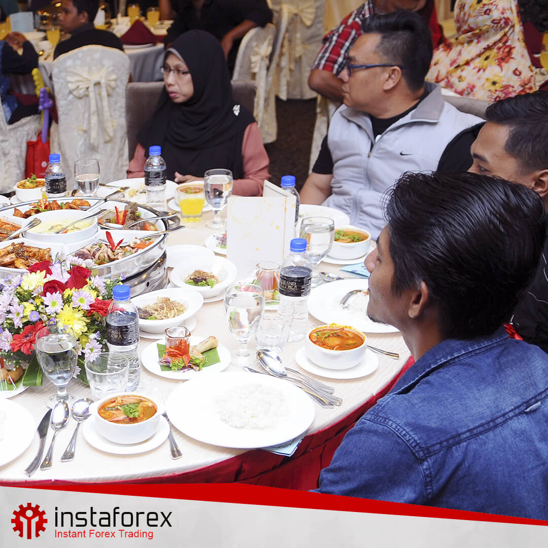 Tetamu untuk Majlis Makan Malam Pedagang Instaforex Kedah menikmati hidangan yang terbaik, dirangkaikan, dan dapat berkongsi idea, berita dan rahsia dalam perdagangan. Semua tetamu dalam acara ini mempunyai minat yang sama — iaitu dalam pasaran pertukaran mata wang asing - supaya mereka mempunyai banyak topik dan cerita untuk dibualkan. Selain itu, para tetamu pada malam itu juga dihargai dengan ucapan Guru forex Muhammad Bin Nordin. Beliau membentangkan kajian menyeluruh tentang analisis teknikal dan berkongsi pengalaman yang terkumpul dan pengetahuannya yang luas, semasa bertahun-tahun kerja dalam bidang kewangan.