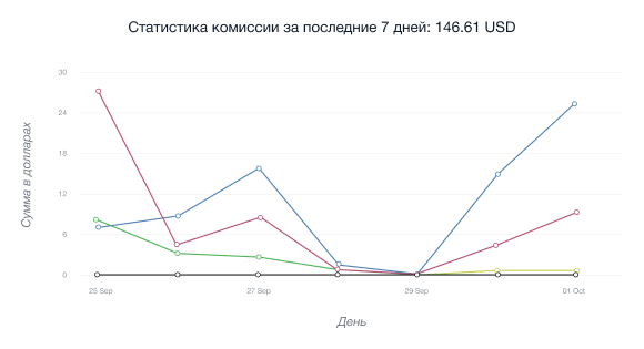 • График сизнинг ҳамкорлик ссылкаси ва ҳамкор ёрлиқлари орқали барча рефералларнинг ўтишлари умумий сонини кўрсатади, танланган вақт периоди учун.